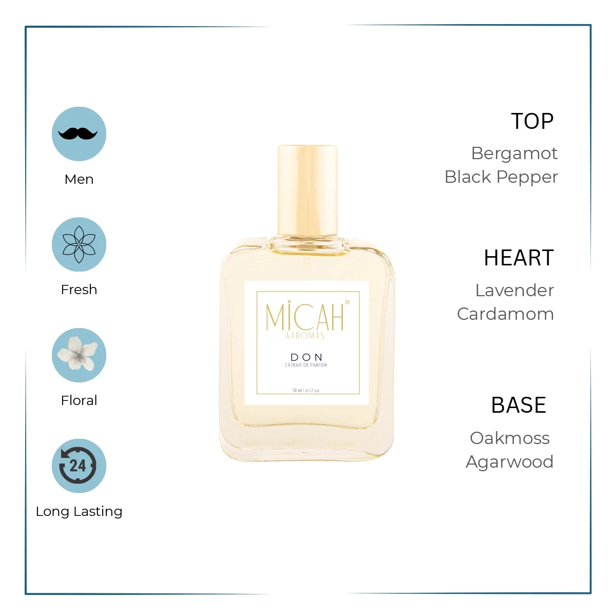 - Middle notes: Black Pepper, Lavender, Cardamom, Juniper Berries and Sage