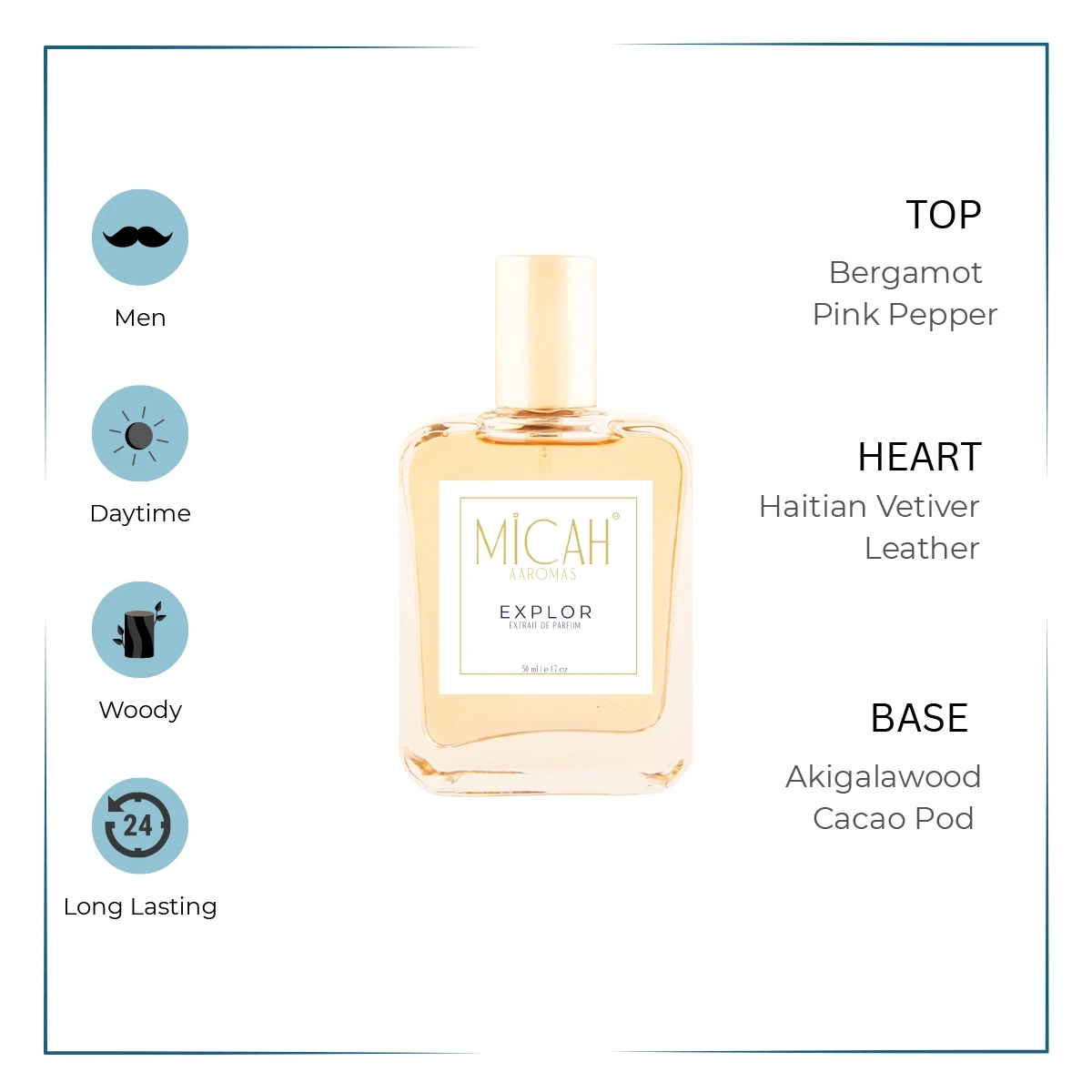 - Base notes: Ambroxan, Akigalawood, Indonesian Patchouli Leaf and Cacao Pod