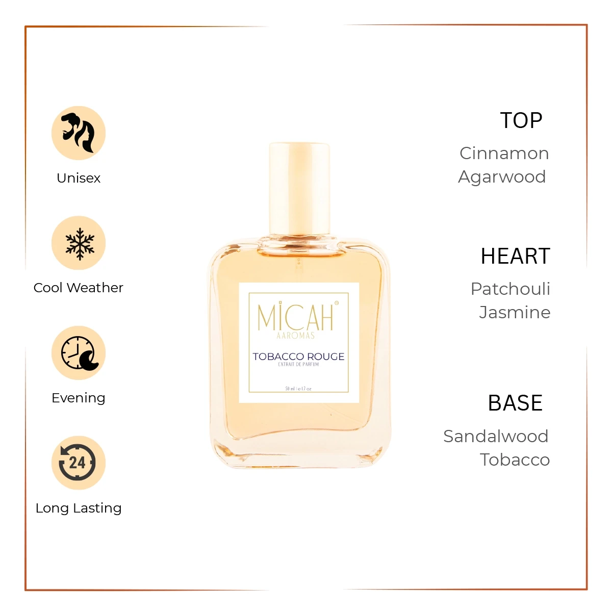 - Base notes: Tobacco, Madagascar Vanilla, Amber, Sandalwood, Guaiac Wood, White Musk and Haitian Vetiver